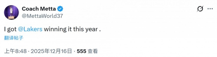 12月16日訊 今天前NBA球員、前湖人球員阿泰斯特發(fā)推談及湖人。