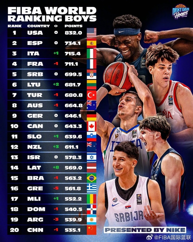 12月21日訊 FIBA國際籃聯(lián)官方微博發(fā)布了新一期國際籃聯(lián)世界U系列男籃實力榜!
