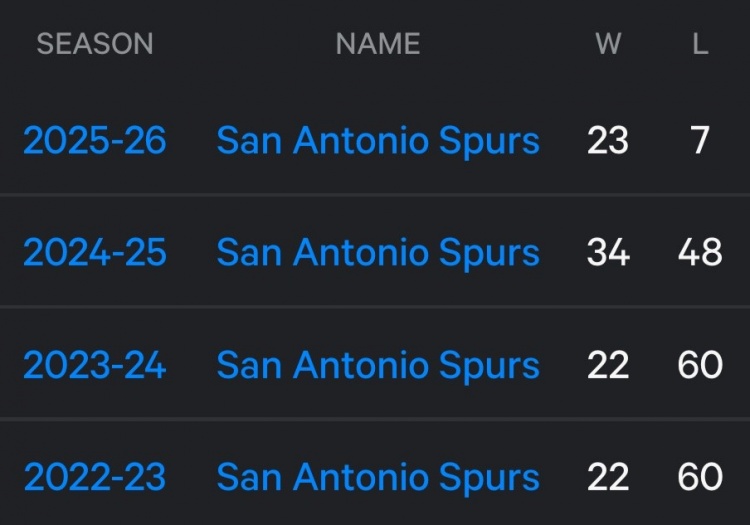 值得一提的是,他們本賽季的勝場(chǎng)數(shù)已經(jīng)超過(guò)了球隊(duì)22-23賽季、23-24賽季的勝場(chǎng)數(shù),那兩個(gè)賽季他們的戰(zhàn)績(jī)均為22勝60負(fù)。而上賽季24-25賽季,他們的戰(zhàn)績(jī)?yōu)?4勝48負(fù)。
