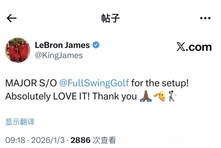 1月3日訊 今日,湖人前鋒詹姆斯更新社媒X,感謝為他安裝室內(nèi)高爾夫模擬器的廠商。