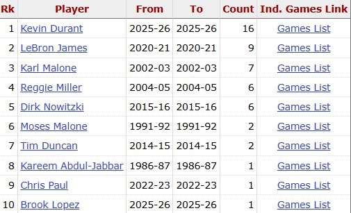 據(jù)統(tǒng)計(jì),這是杜蘭特在生涯18個(gè)賽季第17次砍下30+,歷史最多。詹姆斯9次第二,卡爾·馬龍7次第三。