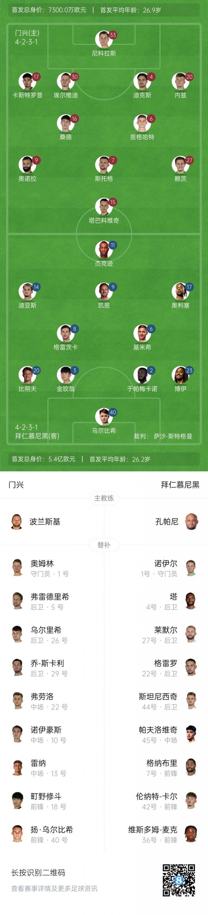 門(mén)興替補(bǔ):1-奧姆林、5-弗雷德里希、10-諾伊豪斯、13-雷納、18-町野修斗、22-弗勞洛、26-烏爾里希、29-喬·斯卡利、40-揚(yáng)-烏爾比希