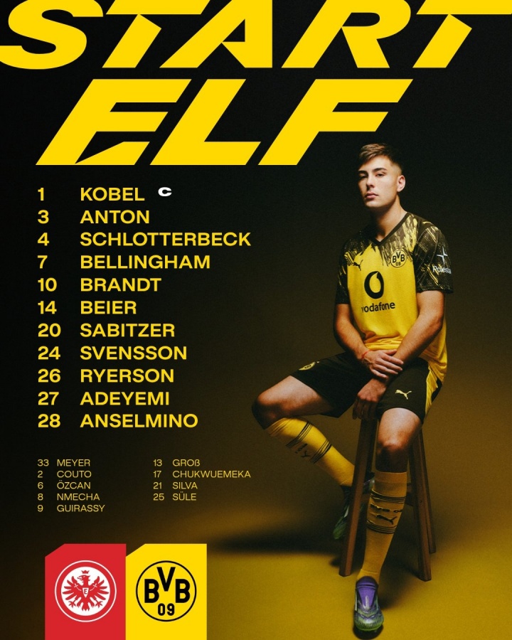 多特蒙德首發(fā):1-科貝爾、3-安東、4-施洛特貝克、7-喬布-貝林厄姆、10-布蘭特、14-拜爾、20-薩比策、24-斯文松、26-萊爾森、27-阿德耶米、28-安塞爾米諾