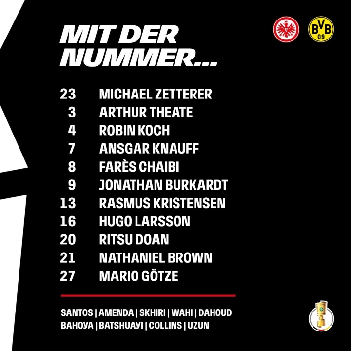 法蘭克福首發(fā):23-澤特爾、3-泰特、4-科赫、7-克瑙夫、8-沙伊比、9-伯卡特、13-拉斯穆斯-克里斯滕森、16-雨果-拉爾森、20-堂安律、21-納撒尼爾-布朗、27-格策