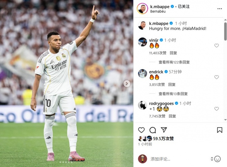 姆巴佩本場比賽打入一球,他寫道:“渴望更多,Hala Madrid!”