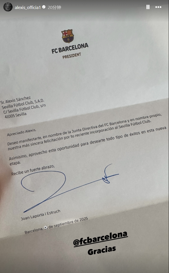 親愛的阿萊西斯,我謹代表巴塞羅那足球俱樂部董事會和我個人,對你最近加盟塞維利亞俱樂部表示最誠摯的祝賀。我也借此機會祝愿你在新的階段取得成功。送給你一個大大的擁抱?!舭?拉波爾塔,巴塞羅那 2025年9月X日。