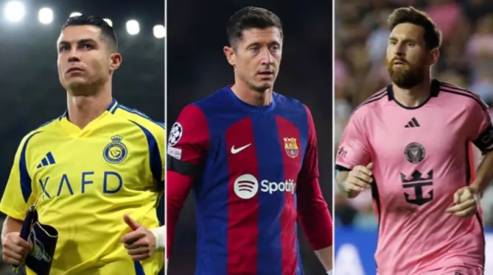 目前在現(xiàn)役球員射手榜上,C羅946球第一,梅西884球第二,萊萬700球排在第三。