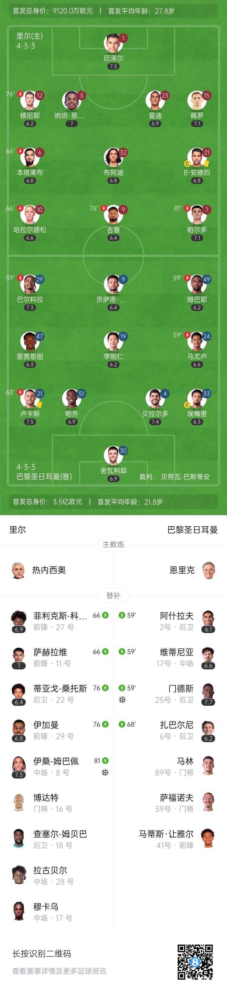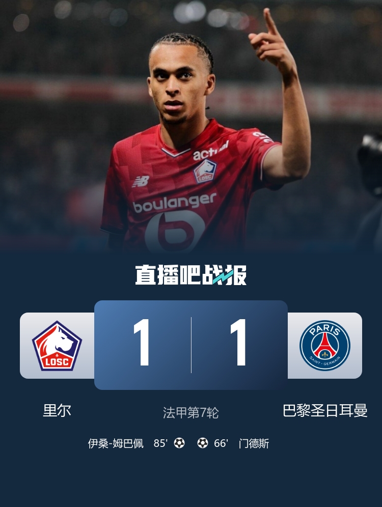 10月6日訊 北京時(shí)間2:45,法甲第7輪里爾vs巴黎圣日耳曼。上半場,雙方均未獲得射門好機(jī)會。下半場,努諾-門德斯替補(bǔ)登場貢獻(xiàn)任意球世界波!姆巴佩現(xiàn)身看臺觀戰(zhàn),弟弟伊桑-姆巴佩替補(bǔ)4分鐘絕平巴黎!最終,巴黎1-1戰(zhàn)平里爾。