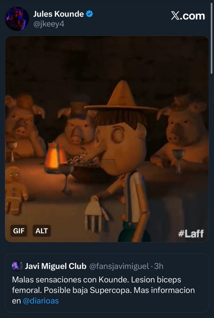 記者Javi Miguel社媒表示,孔德的傷情令人擔(dān)憂,初步診斷為股二頭肌受傷,可能缺席西班牙超級杯。