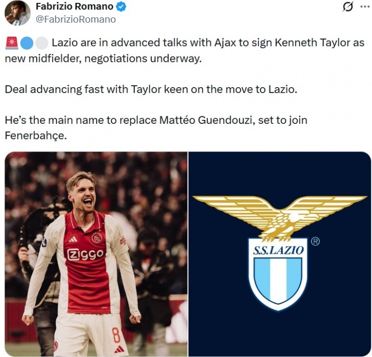 1月7日訊 據(jù)知名轉(zhuǎn)會(huì)記者羅馬諾報(bào)道,拉齊奧與阿賈克斯就中場(chǎng)肯尼思·泰勒交易進(jìn)行深入談判。