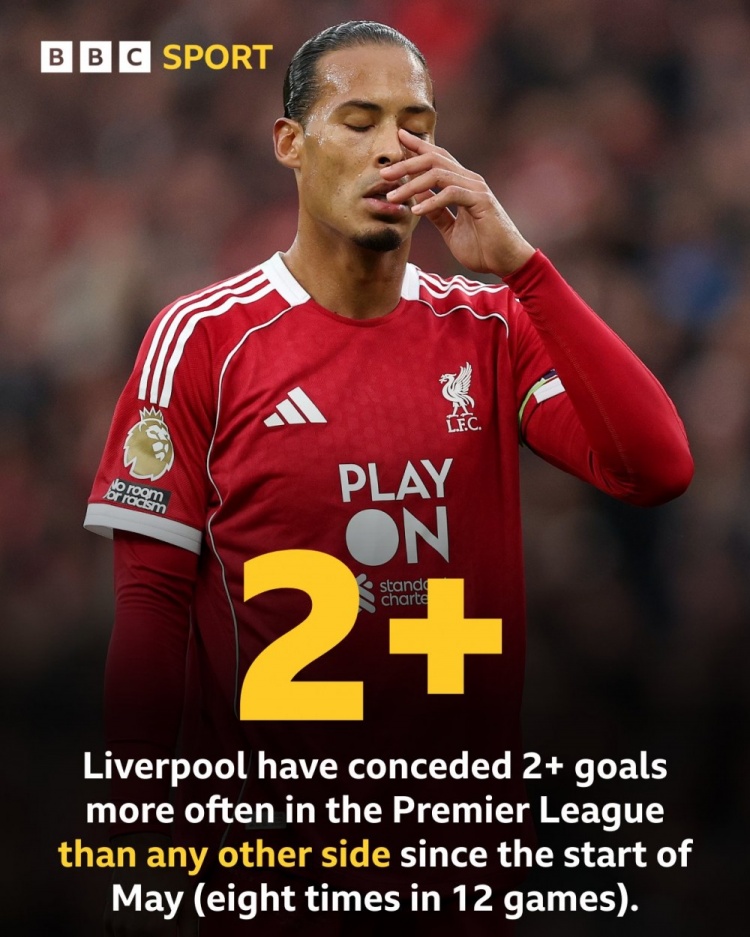 據(jù)BBC統(tǒng)計,5月初以來,利物浦參加12場英超比賽,其中8場至少丟掉2球,同期丟球2+場次英超球隊中最多。