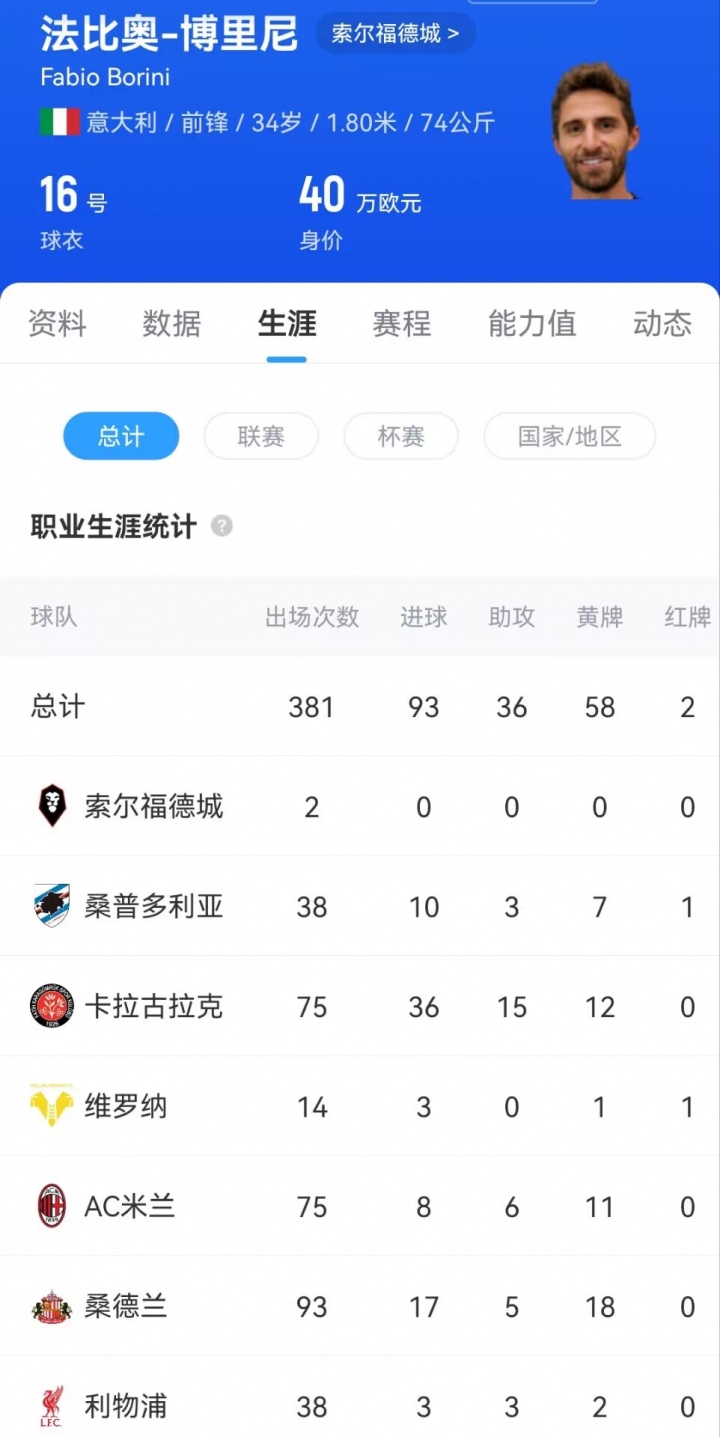現(xiàn)年34歲的博里尼職業(yè)生涯曾效力于羅馬、利物浦、AC米蘭等隊(duì),職業(yè)生涯輾轉(zhuǎn)多支球隊(duì);他在桑普多利亞效力了兩年,僅上場(chǎng)38次。今夏,他成為自由球員并加盟索爾福德城,簽下一份短期合同。
