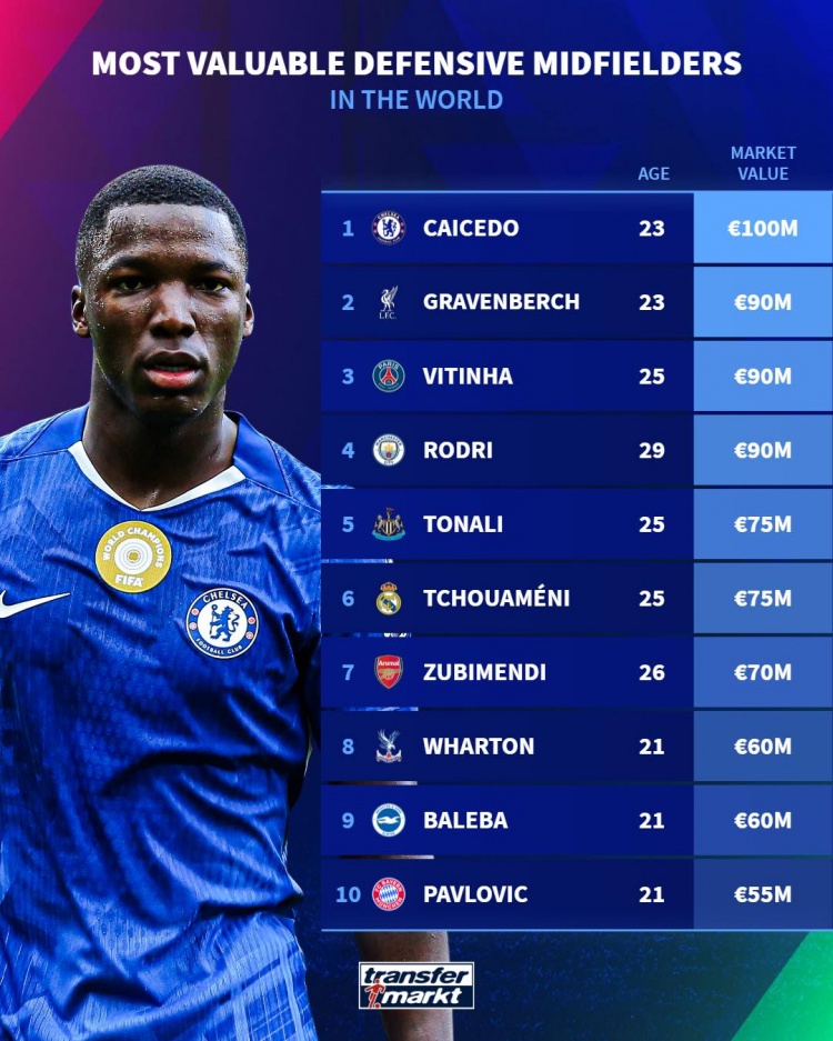 11月2日訊 德國轉會市場列出了防守型中場身價排名,凱塞多以1億歐居首。