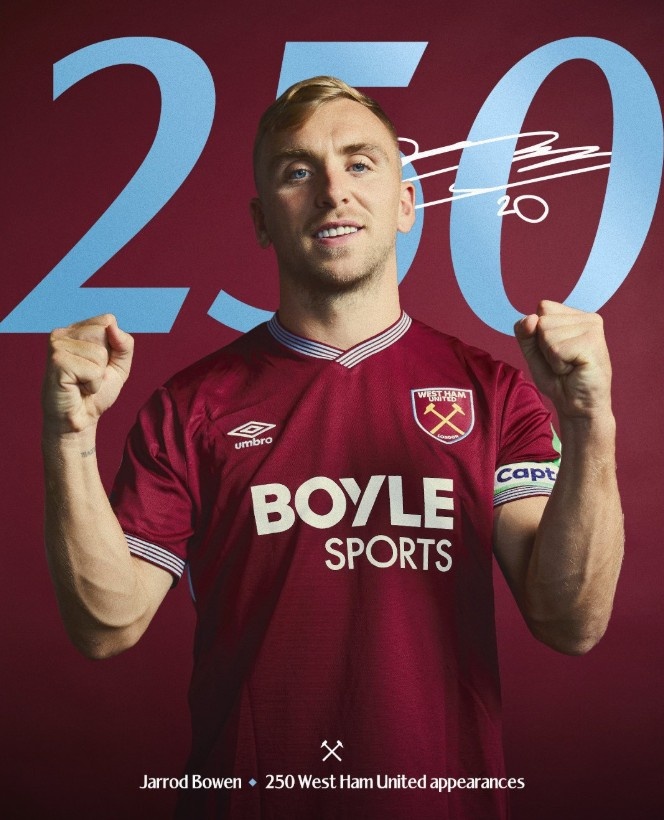 11月8日訊 英超第11輪比賽,西漢姆聯(lián)在主場(chǎng)迎戰(zhàn)伯恩利。本場(chǎng)比賽,鐵錘幫前鋒鮑文首發(fā)出戰(zhàn),迎來自己在球隊(duì)的250場(chǎng)里程碑之戰(zhàn)。