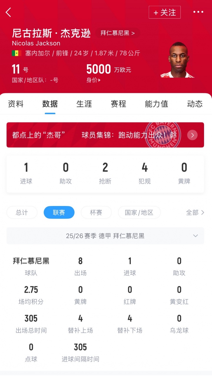 報(bào)道稱,杰克遜本賽季后何去何從仍無定論,鑒于他迄今為止出場時(shí)間有限(各項(xiàng)賽事僅五次首發(fā)),目前來看,以埃貝爾為首的拜仁管理層,不太可能在賽季末主動(dòng)支付租借合同中約定的巨額買斷費(fèi)(6500萬歐元)。