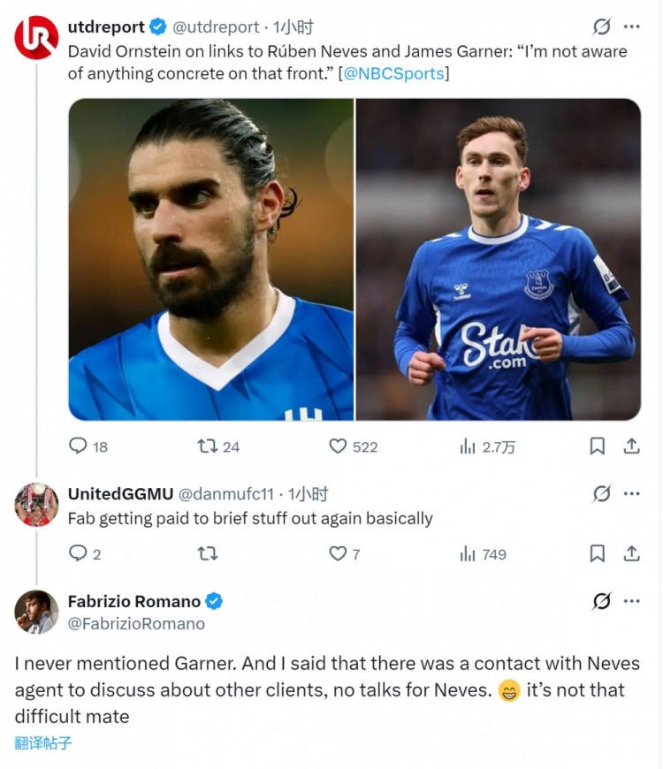 對此羅馬諾留言澄清:“我從來沒有提到過加納。而且我說的是曼聯(lián)和魯本·內(nèi)維斯的經(jīng)紀人聯(lián)系,只是討論其他客戶,沒有關于魯本·內(nèi)維斯本人的談判。這并不難理解啊,哥們兒?!?/p>