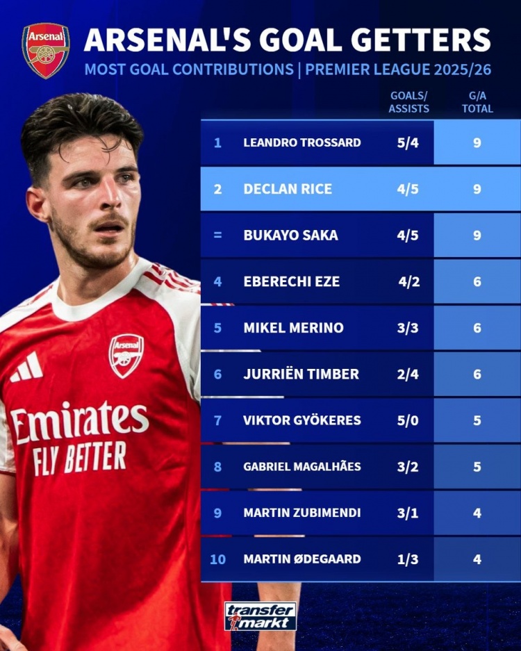9球:特羅薩德(5球4助攻)、賴(lài)斯(4球5助攻)、薩卡(4球5助攻)