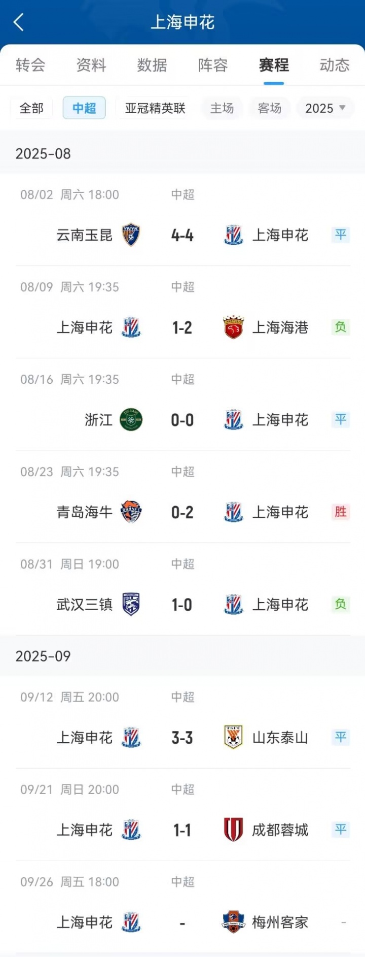 此外,申花在被蓉城絕平后還遭遇了2連平+3輪不勝。