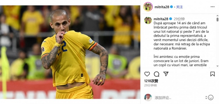 米特里策在社媒寫道:“在首次穿上國(guó)家隊(duì)球衣近14年、完成一線隊(duì)首秀逾7年之后,我迎來了一個(gè)艱難卻必要的決定:從羅馬尼亞國(guó)家隊(duì)退役。