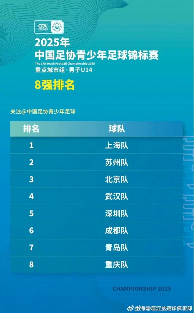 10月18日,2025年中國足協(xié)青少年足球錦標賽重點城市男子U14組第三階段在武漢賽區(qū)落幕,上海U14以3-0的比分戰(zhàn)勝蘇州隊奪冠,嘉定匯龍青訓球員周俊怡、周墨隨隊出戰(zhàn)并斬獲多個個人獎項。