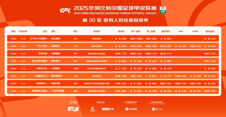中甲第30輪裁判具體安排如下(詳情見圖):